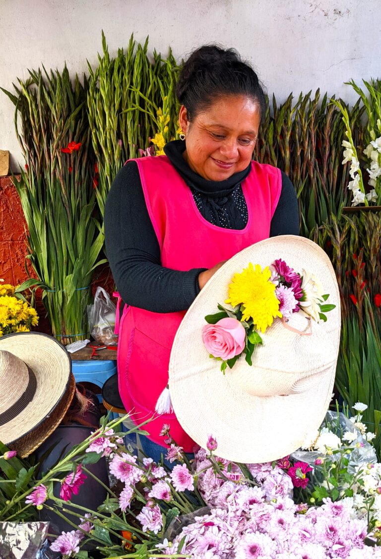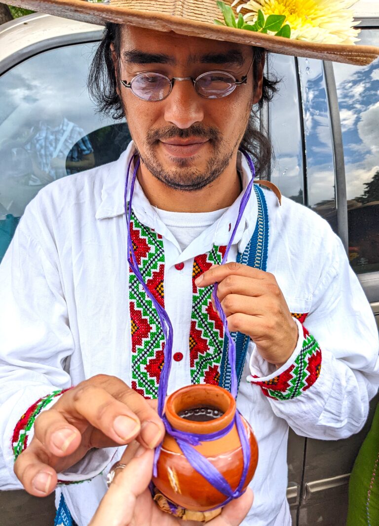 We went about preparations, buying wide brimmed straw hats typical of the region before handing them off to the florist to have them adorned with flowers. We bought small mugs attached to ribbons that hung around our necks. I bought an embroidered blouse and a colorful shawl and a bag woven from fiber of maguey.