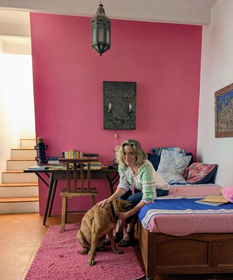 I gazed around my space, the landing in the heart of my house where I’ve recreated my little girl bedroom, with just as many shades of pink but no doors this time around. I can no longer be shut away. As I took a sip of cold tumeric tea and leaned down to rub the soft shepherd dozing beside me, a voice rose up in the quiet:
